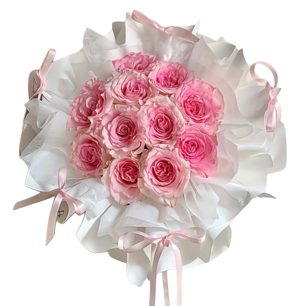 Buket yang indah ini menampilkan bunga mawar merah muda segar yang disusun dalam gaya semula jadi yang lembut, dibungkus dengan kertas putih yang elegan dan diikat dengan pita. Sesuai untuk menyampaikan kasih sayang, penghargaan, atau doa baik pada bila-bila masa istimewa.