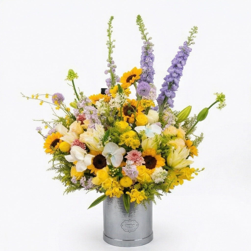 A grand and vibrant garden arrangement featuring bright yellow sunflowers with dark honey centers as the bold centerpiece, beautifully contrasted by pure white lilies and delicate yellow daisies. Wisps of purple stock flowers and baby’s breath add vertical elegance and a soft, romantic touch, while vibrant greenery and variegated leaves create natural depth. Arranged in a sturdy foam bucket base, finished with decorative wrapping for a polished presentation. The full, abundant composition brings warmth and joyful energy to any space – ideal for grand celebrations, premium gifts, or creating an unforgettable centerpiece. Size: Approx. 90-120cm height, 50-65cm width