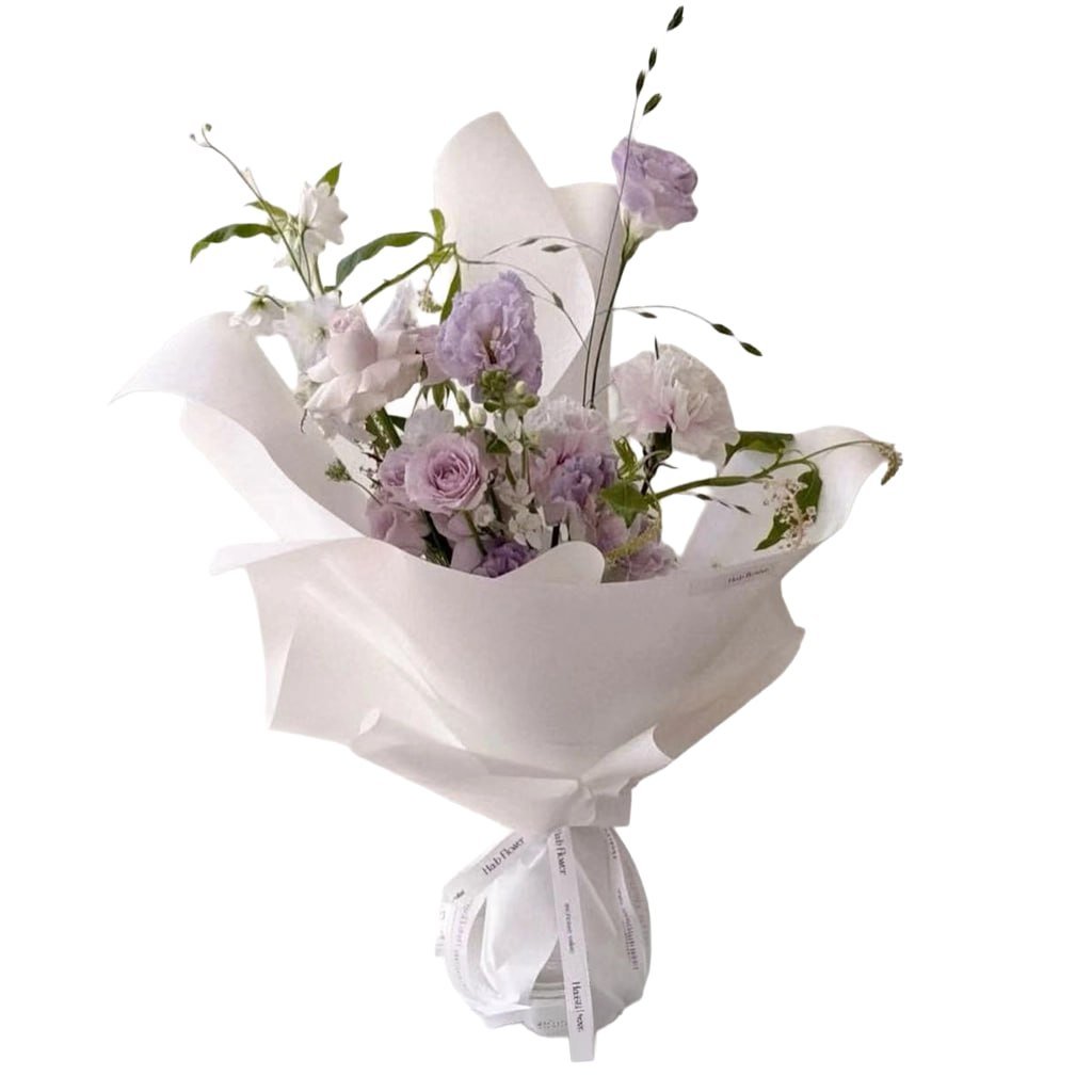 Buket ini dirangkai dengan cantik menggunakan campuran bunga ros ungu, lisianthus putih, dan bunga pengisi halus. Dibungkus dengan kertas tisu putih bersih dan diikat dengan pita bertuliskan logo jenama, ia memancarkan kesan kemurnian dan ketenangan. Sesuai untuk menyampaikan perasaan tulus atau menambahkan sentuhan elegan kepada sebarang acara.