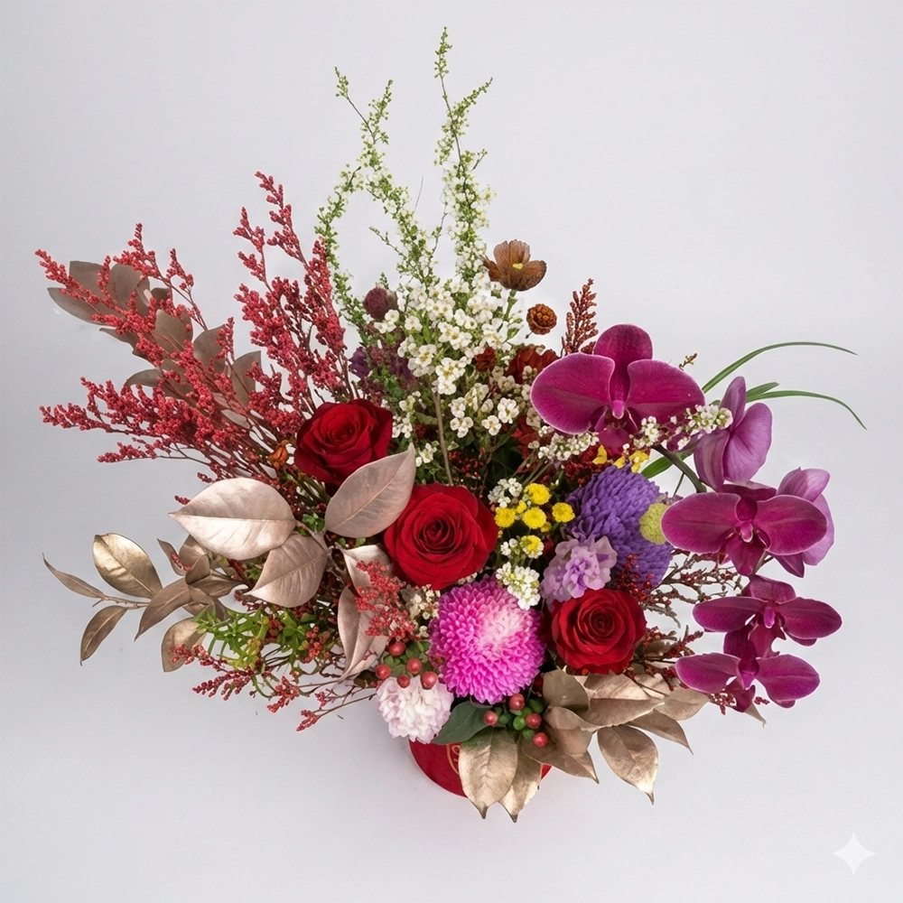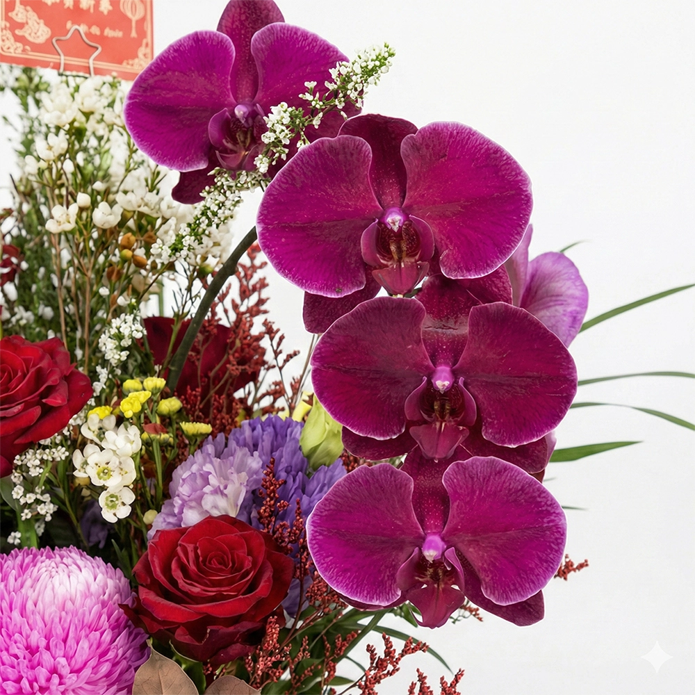 Ia digabungkan dengan Mawar Merah klasik dan Kekwa Merah Jambu yang ceria untuk sentuhan perayaan yang meriah. Tambahan daun keemasan dan beri merah melambangkan limpahan rezeki dan kemakmuran untuk tahun yang akan datang.
