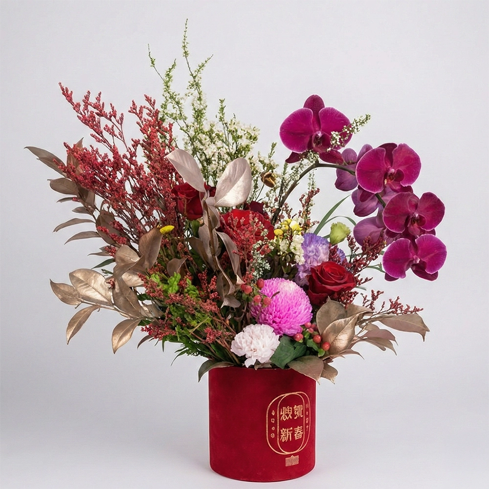 Disusun indah dalam kotak baldu merah premium yang dicetak dengan ucapan keemasan “Selamat Tahun Baru” (恭贺新春) dan “Semoga Berjaya & Makmur” (大吉大利), gubahan ini adalah hiasan tengah yang sempurna untuk kediaman anda atau sebagai hadiah korporat eksklusif musim perayaan ini.