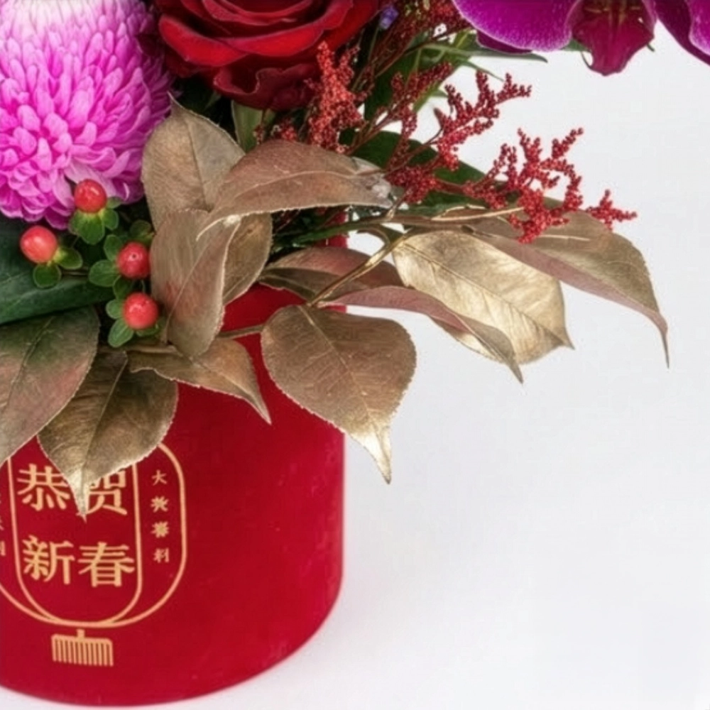 承载这件花艺作品的红色丝绒抱抱桶上,烫金印有“恭贺新春”与“大吉大利”的贺词。无论是摆放在家中客厅招财纳福,还是作为高端商务伴手礼馈赠贵客,都能彰显您的非凡品味与诚挚祝福。