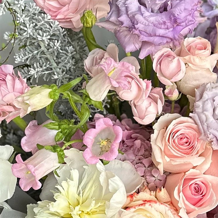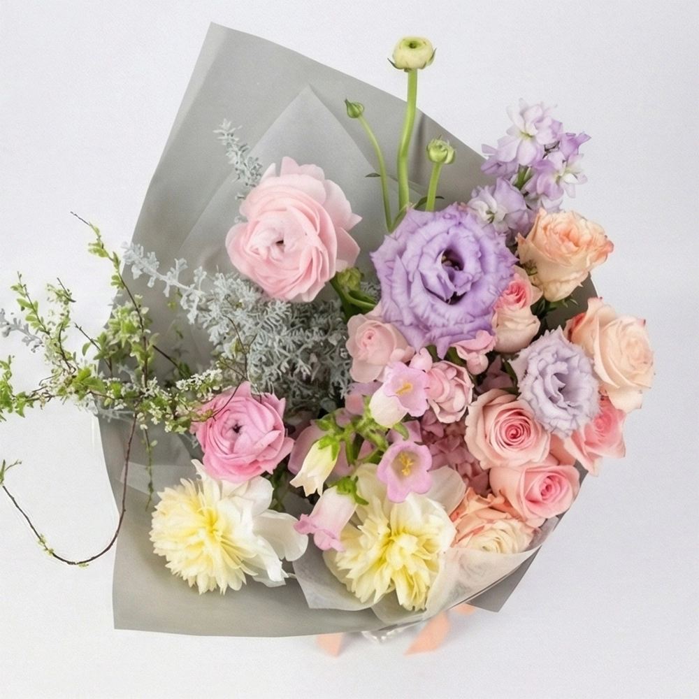 花艺师精心挑选了优雅的淡紫色洋桔梗 (Lisianthus)、甜美的粉色玫瑰与洋牡丹 (Pink Roses & Ranunculus),以及纯洁的白色大丽花 (White Dahlias)。搭配自带高级感的**银叶菊 (Dusty Miller)**与灵动的碎花枝条,营造出一种仿佛置身于莫奈花园中的梦幻感。