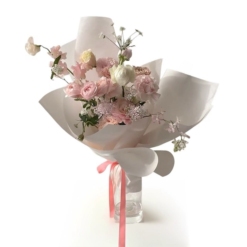 A delicate bouquet of soft pink roses and baby’s breath wrapped in elegant white paper. | 一束柔和的粉玫瑰与满天星,用优雅的白色纸张包裹。 | Sebuket bunga mawar merah jambu lembut dan bunga bayi yang dibungkus dengan kertas putih elegan.